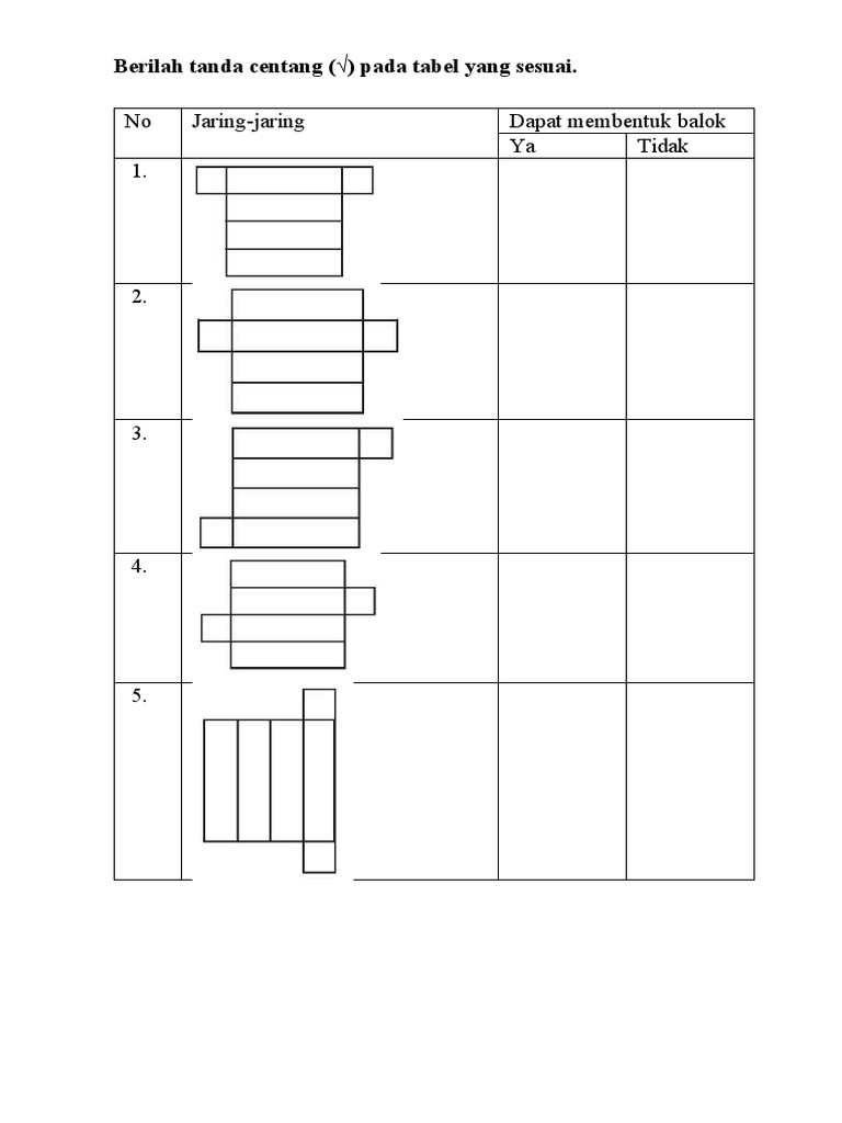 Cara Membuat Jaring-Jaring Balok. Perhatikan pilihan jawaban yang disajikan. Jaring balok lebih banyak dan bervariasi bila dibandingkan dengan jaring di dalam kubus Hal ini karena sisi balok terdiri dari flat segiempat.